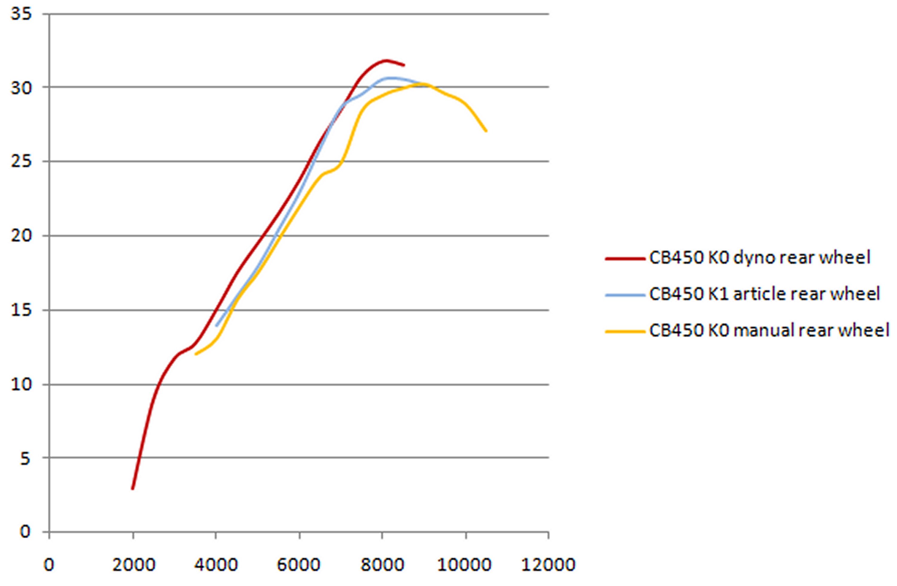 There are two CB450 K0 curves (dyno curve and manual curve) and one CB450 K1 curve (curve article). Is it fair to compare all three curves ?, I think it is, because it also shows the differences between the engines.
