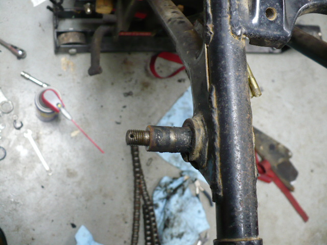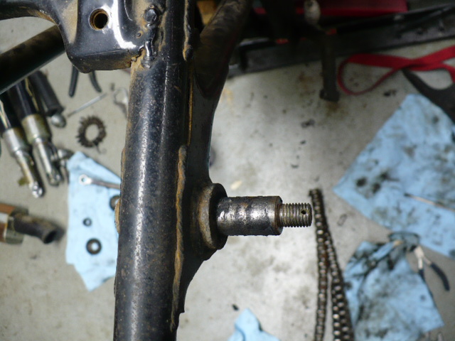Almost have everything off the frame, just need to remove wire harness and engine. I noticed on my upper shock mount studs there are holes drilled for a cotter or clip. I have not noticed that on later bikes. I only see one part number for the blind nut, no revisions.