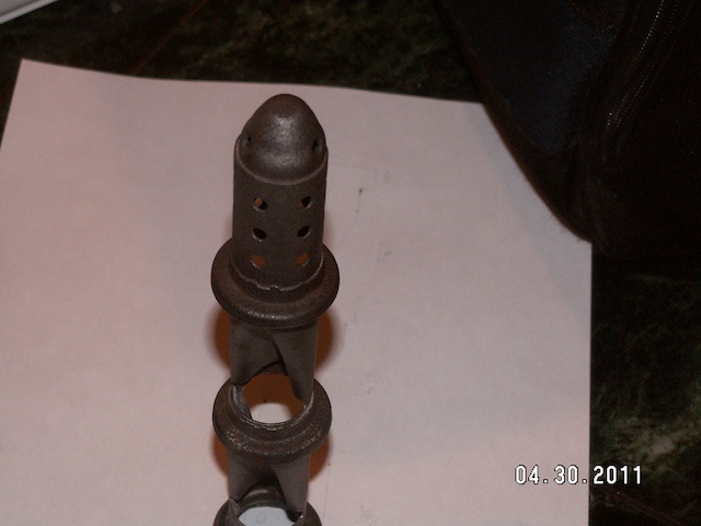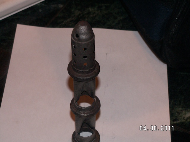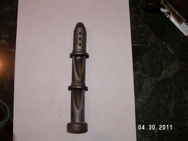 Wow, that was quick. And nicely done, too, George. A few more questions. How many holes in the cylindrical part and the conical end cap? I'm gonna guess 15 holes in the cylindrical part because they don't look diametrically opposed, and 3 in the cap. Also what diameter are the holes?geosar wrote:Here is a rough drawing with some numbers. You are correct, the wire is for twisting it out of the pipe. There is also a threaded hole in the rear flange to accommodate a small, chrome bolt. That is a 7 inch ruler at the bottom.