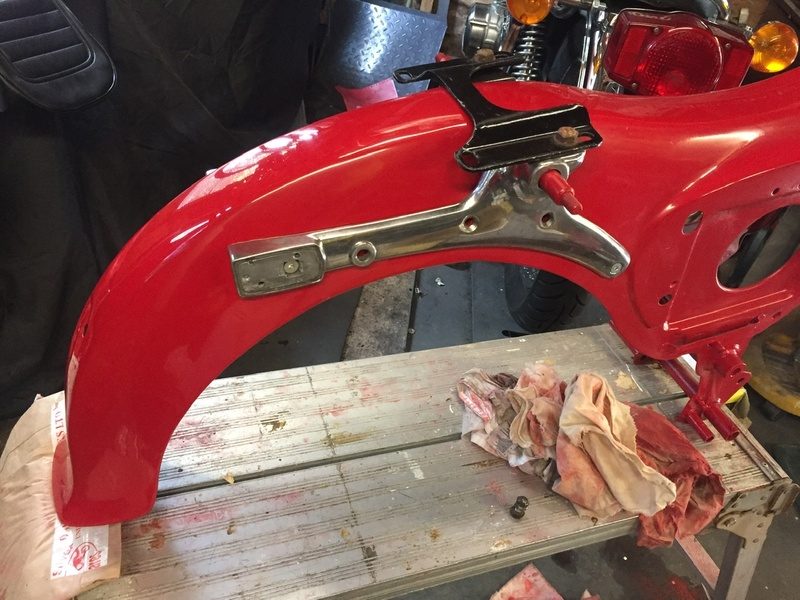 Rear shocks rebuilt, the homemade spring compressor works well. I had to respray the front mudguard as I went through to the primer along the edge, amateur mistake.