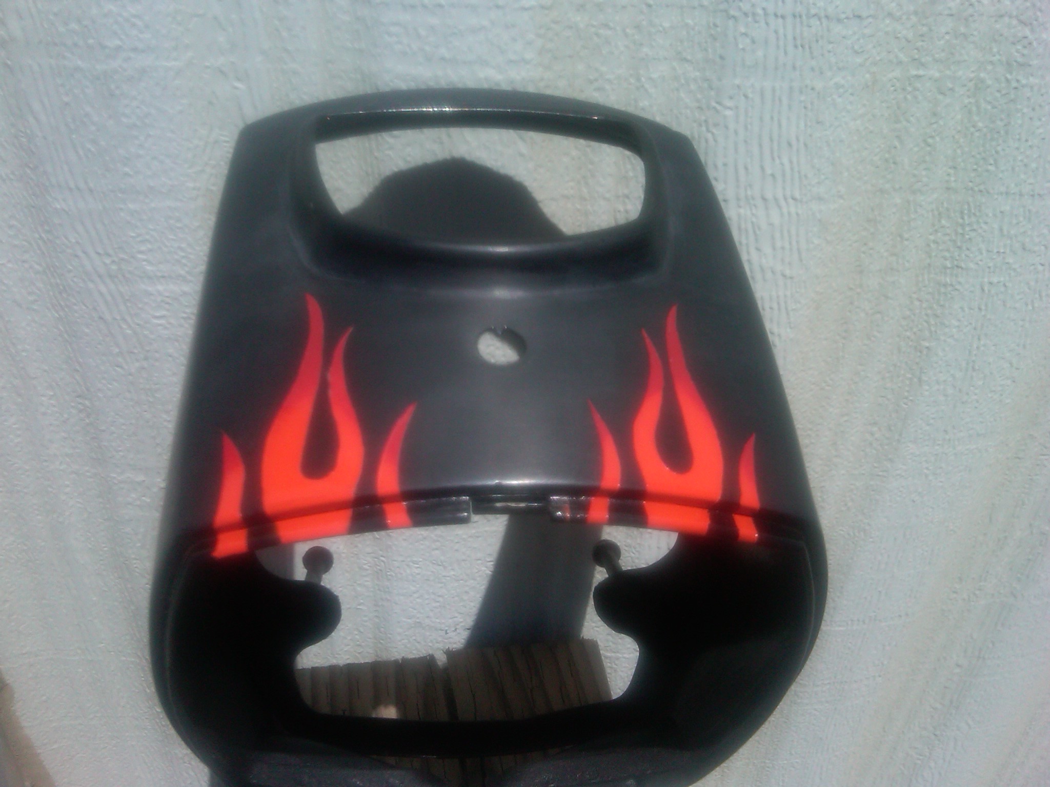 I decided to paint the bike black, but I'm working on putting my personal touch on it in the form of flames. I've done a test flame on the headlight housing, I think my system will work out fine, but of course this is just a small piece.