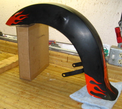 Progress is slow. I've been working on the front end paint, almost done. I had the front fender laid out for flames, didn't like how it would look installed and started over again. Here's the result.