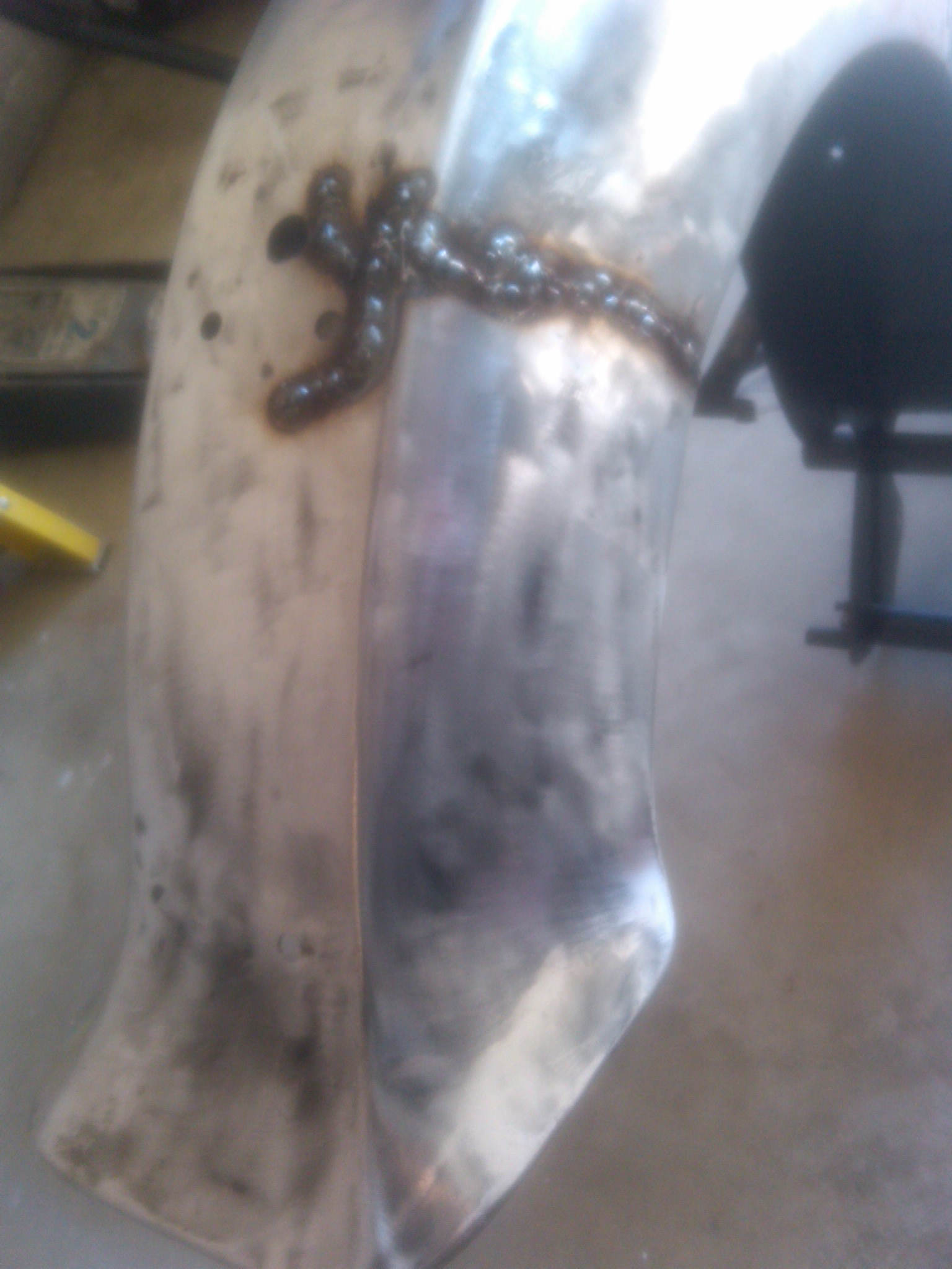 The major project is the rear fender. As you can see there was a major crack on the side. A PO had welded up the side but hadn't bothered to line it up. The repair was done with a bunch of Bondo. There were also several cracks that went across the top that hadn't been repaired. I cut out his patch and drilled the ends of all the cracks and rewelded. The picture isn't the finished product of the welding, I just got it back to it's original shape. I also found 2 holes in the back of the fender. Apparently something was mounted there causing a crease and a crack next one of the holes. They're all welded now, so its on to the final shaping and painting.