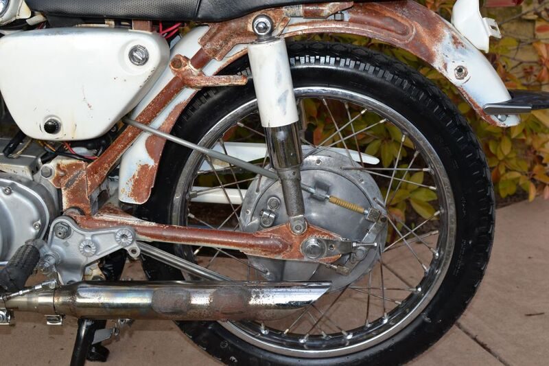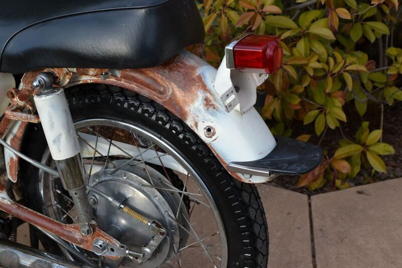 Today was the day that I drove it down the street for the first time. It has been decades since this pile of parts was last a motorcycle. It has been quite a process but I have tried to enjoy the journey and not rush to the finish line. That being said I did want to get to a place where I could find out if I could turn it in to a motorcycle again and I did! The final challenge was the clutch. I must have read most of the posts regarding the clutch on this forum....and there's a lot. Switched over to a five disk clutch basket with a thick Plate A and no wires. I'll let you know after I get some time on the bike to see if it holds up. Turns out the clutch cable/clutch cable sleeve ratio was not allowing the clutch actuator to start at the 7 oclock position. I've found that is critical. I now have a clutch that is working and gears that shift. My regular motorcycle is a Harley softail and the last time I rode a bike like the Superhawk was in the mid 1960's. I feel a little bit like a big kid on a tricycle going down the street. Anyway, I didn't start this project to make a new daily rider. I had in the back on my mind that I might want to take this rustoration to a few bike/car shows around the area. I thought maybe a few gearheads would like to see one of these old bikes again because they are not something you see often. If some people think I am polishing a turd so be it. I've had a lot of fun with it so far and it has got my retirement off to good start. Thanks to everyone who encouraged me and responded to my questions posted on this forum. Here's a few pics.....one from Sept and some from today after putting on the correct tank badge and mudflap. Everything is done except tuning it up but I wonder if a project like this is ever "done".