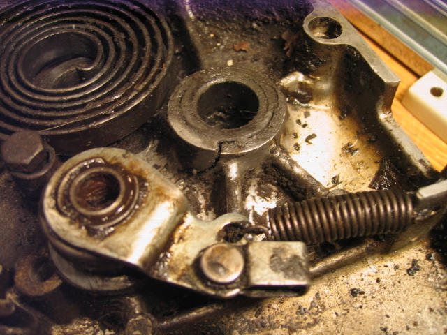 In the meantime I puzzled over how to remove the clutch lifter from the crankcase cover and it wasn't obvious. The plastic plug on the outside of the case has a slot which seems to invite the use of a very large screwdriver but it doesn't appear threaded. I'm not big on just whacking stuff with a hammer if I don't know what I'm doing so I've put it aside. I'd like to get in there and clean that ball bearing, that's for sure.