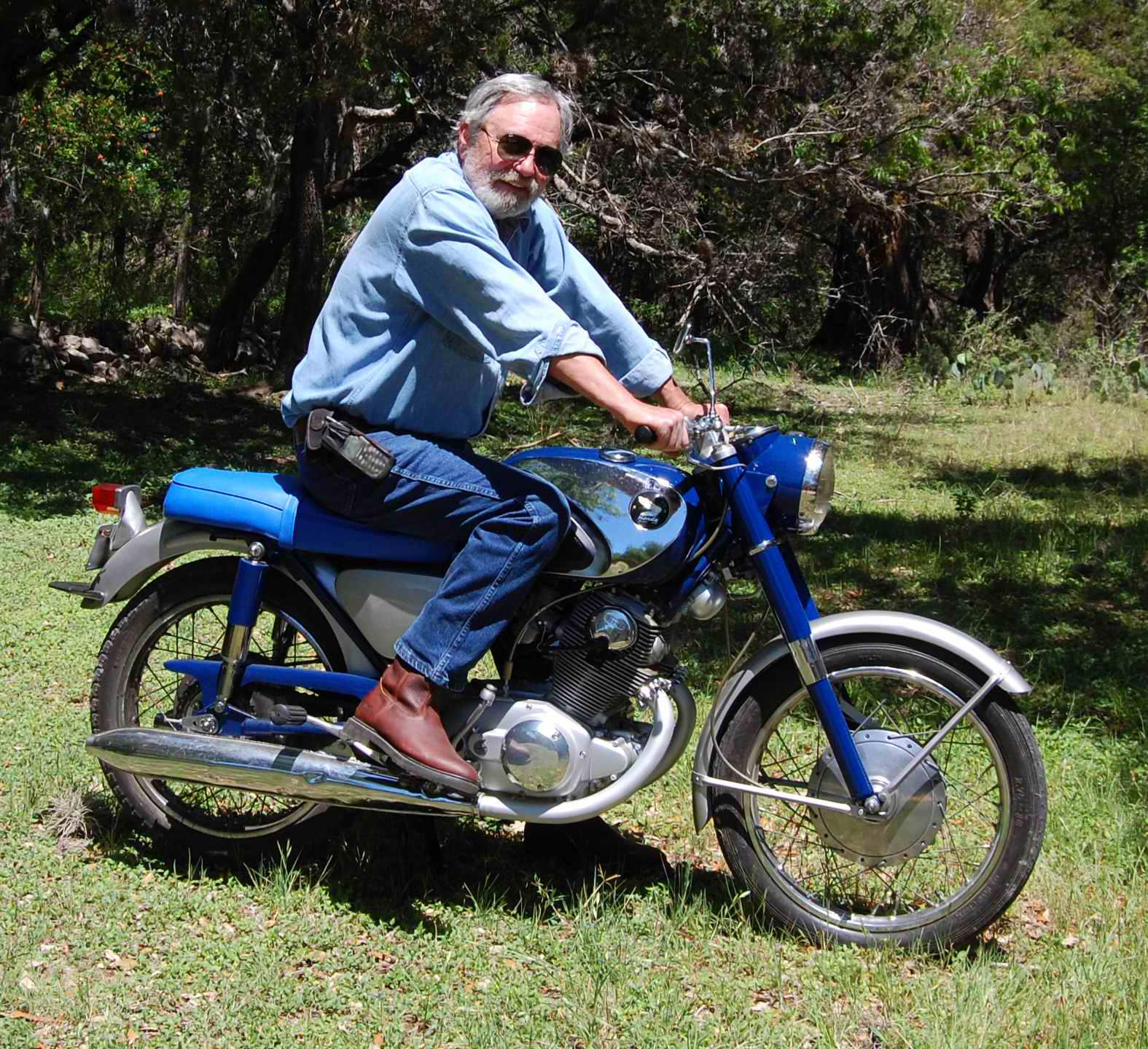 So, for around six times what bike originally sold for, I’ve got an essentially mechanically new CB77…rebuilt engine, transmission, carbs, brakes, front forks, rear shocks, seat (a little lumpy looking but sits good), greasy wheel bearings, fork bearings with three new races, lots of new ball bearings to replace those that ended up under porch. New sprockets. New handlebars and levers. More or less trued and well balanced wheels. New tires and battery. Plus a shiny paint job that looks better than when I bought the bike at one year old. I’m so happy.