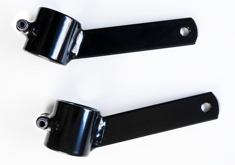 I measured these brackets next to the existing ones on the bike, and the headlight housing will end up sticking out about 2" further from the forks than stock, and it may be slightly higher. Hopefully that won't look too horrendous or affect wiring length, tach cable length, etc etc.