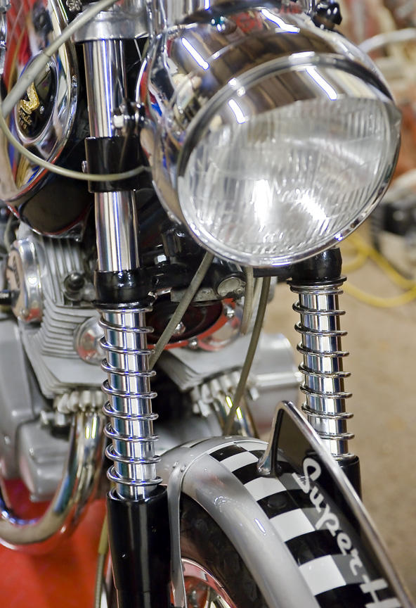 What is happening is that the front end is going to change. Frank's Forking is making new fork tubes, and the upper fork covers/headlight ears are going away. So it's going to be the chrome fork tubes all the way up, more of the external springs will be showing, and a pair of John Tickle headlamp brackets from the '60's will be used. It think it will look cleaner, and it'll really be more along the lines of how I intended the front to look.