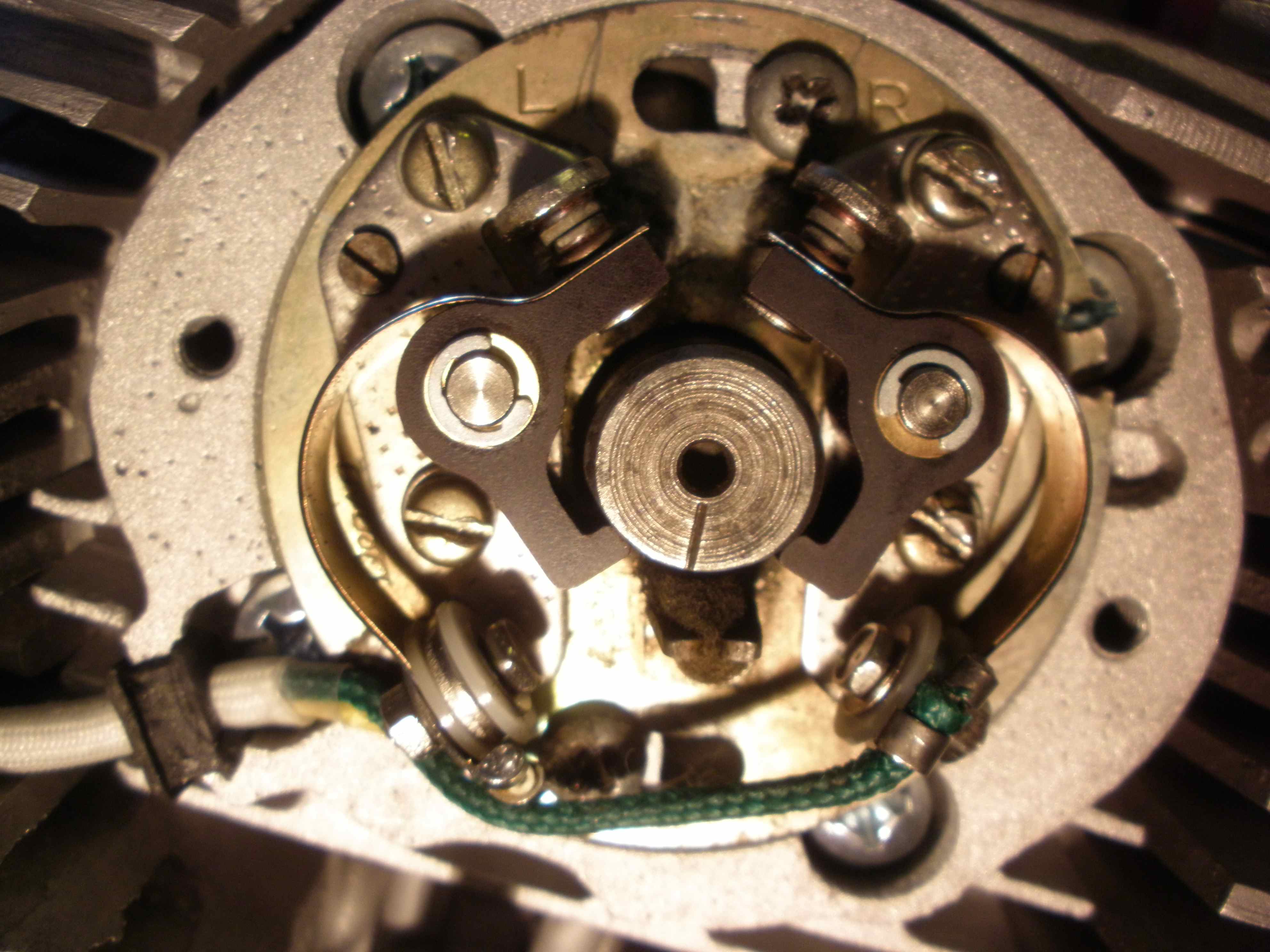Not sure if you figured this out, but check out this thread on cam chain installation. When the crank with the right piston is at TDC, the points cam will be at 12 noon.maia wrote:Maybe someone can give me their 2 cents worth on this one. In order to move the points backing plate to a place where the timing is correct acording to Ed's tunup I had to enlarge (make longer) the slots in the plate by about 2mm. When installing the cam chain ...pointer on "T" the line on the cam points down. Well it points down allright as you can see in photo but it just points straight down and I'm wondering if it should point directly at the center of the crank. If I put a straightedge on the line it's not out by much when it gets to the crank. It almost seems like I might have been out a tooth when I put the chain on. I'm just beginning to sort out carb setting etc. but it seems to start right up and run fine. Should I just ignore all this? Thanks alot for all your help along the way, I'm on the final strech now with completing this project, I'll keep you up to date.