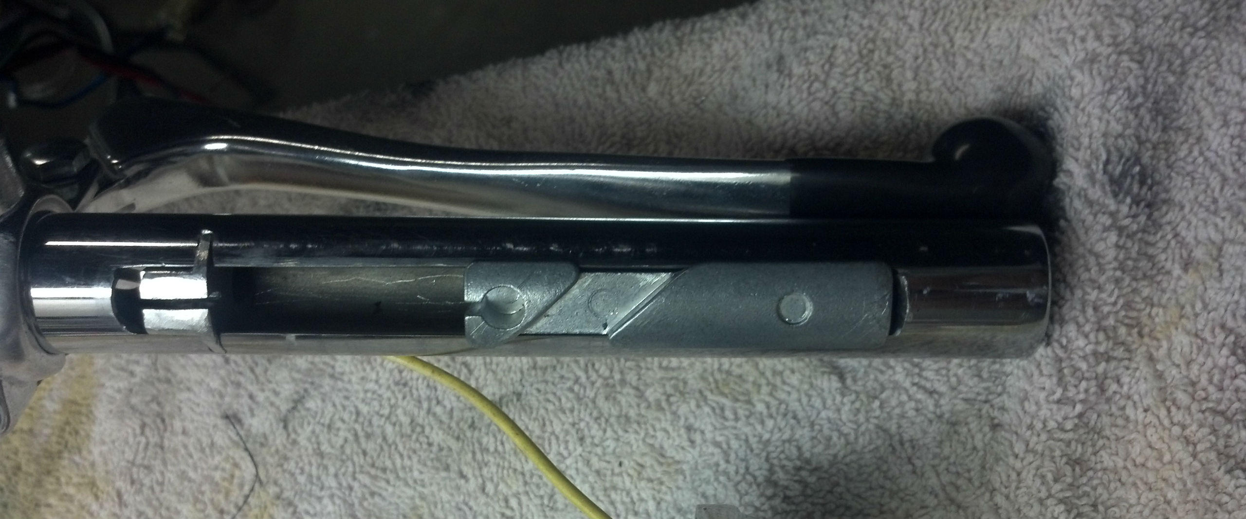 I got to one of the things I was dreading, drilling and cutting the handlebar to fit. After measuring and comparing to the original (bent and rusty) handlebar countless times before going forward, I've got all the holes drilled and cut along with the slot for the slide. The slot was where I took the most care and I think it turned out great. My biggest concern was keeping the slot parallel with the bar, anything off from that would change the relative angles between the throttle handle and the throttle hinge and cause binding on the slide. I obtained a new throttle hinge ( the angled slot on the top had some funky wear) and it slides easily with everything in place but the cable. I haven't hooked up the cable yet, but I don't forsee any problem there.