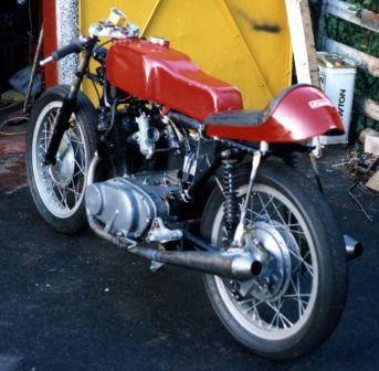Magoo-Here are some picts of my '66 race bike. Disregard some of the shotty bits like numberplates/brackets,tach. holder,damper and shifter as they have been replaced since these picts were taken. I'm runnin Swarbrick megs rolled to CYB specs with a stock head pipe. They make no power till about 5500rpm and then the bike comes alive till abut 8500rpm. I fab'd a set of caps that can be riveted onto the meg so I can add Supertrap tuning discs for some tunability below 5500rpm and drop DB's. The engine that is in it in this picture is a stocker from my street bike with some minor tweaks just so I could get the chassis setup. I'm workin on puttin a 350cc magneto fired engine together with new parts that are bein made by a fella in Washington state.