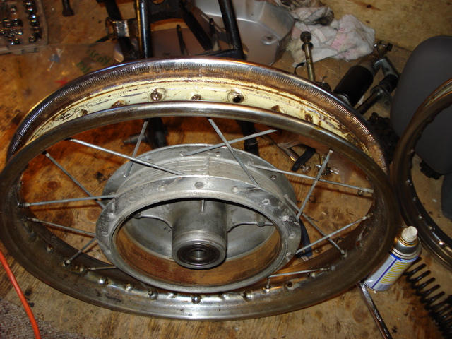 I did lace my wheels myself as well....After I found out how much money people wanted to do it!. Since I didn't have a trueing device, I used my Black and Decker Workmate, opened the jaws, put the axel through the wheel, and "hung" the rim down between the wooden jaws. I then took the 2 fork bottom caps, (later alloy forks), took some wood screws and screwed them into the jaws so I would have someplace to set the axel in, and it would be stable enough to spin the rim so I could get it true. Then I took a ruler and set it by the rim so I could see in/out, side to side movement. It worked great. Then you just have to be patient and work the spokes until it's true.....and here's a pic of the last spokes to come out/ first to go back in, in case you need pics of where to start.