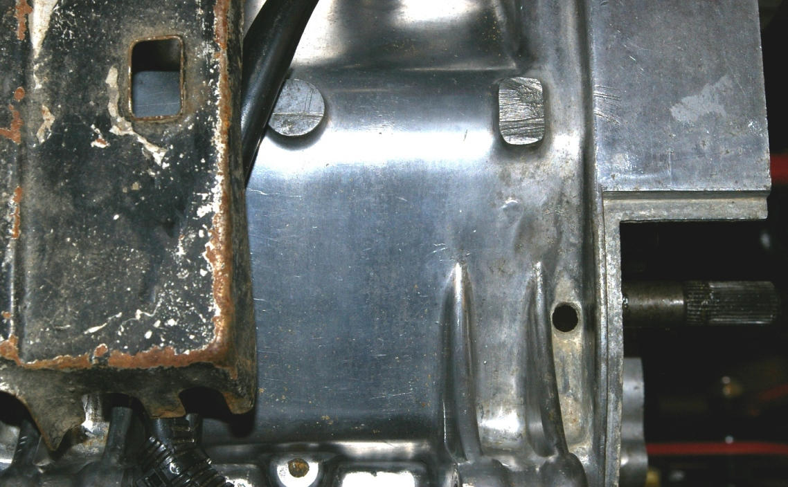 As far as the 'mystery hole' goes, I'm going to propose a theory after noticing another anomaly in the case. The photo shows where a previous owner had used a hacksaw to cut away an ear that extended up through the upper crankcase cover. My guess is that the carbs were over-flowing so the PO cut away the ear in order to run over-flow tubing through the slot in the cover plate. Then he drilled the mystery hole so that the fuel could drain into the drive chain area. I'm sure the hole is not stock, and there appears to be fuel residue and pitting similar to what you see in old carb bowls. That's my guess.