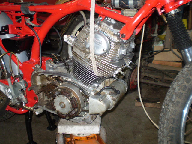 I wrestled the engine out of the frame today and flipped it ready for the transmission analysis. But on the way, I disassembled the starter planetary reduction gearset. The motor would run, but not turn the engine. I figured probably a bad freewheel clutch, but it was tight when I tugged on the top run of the chain, and freewheeled when I pulled on the bottom run.