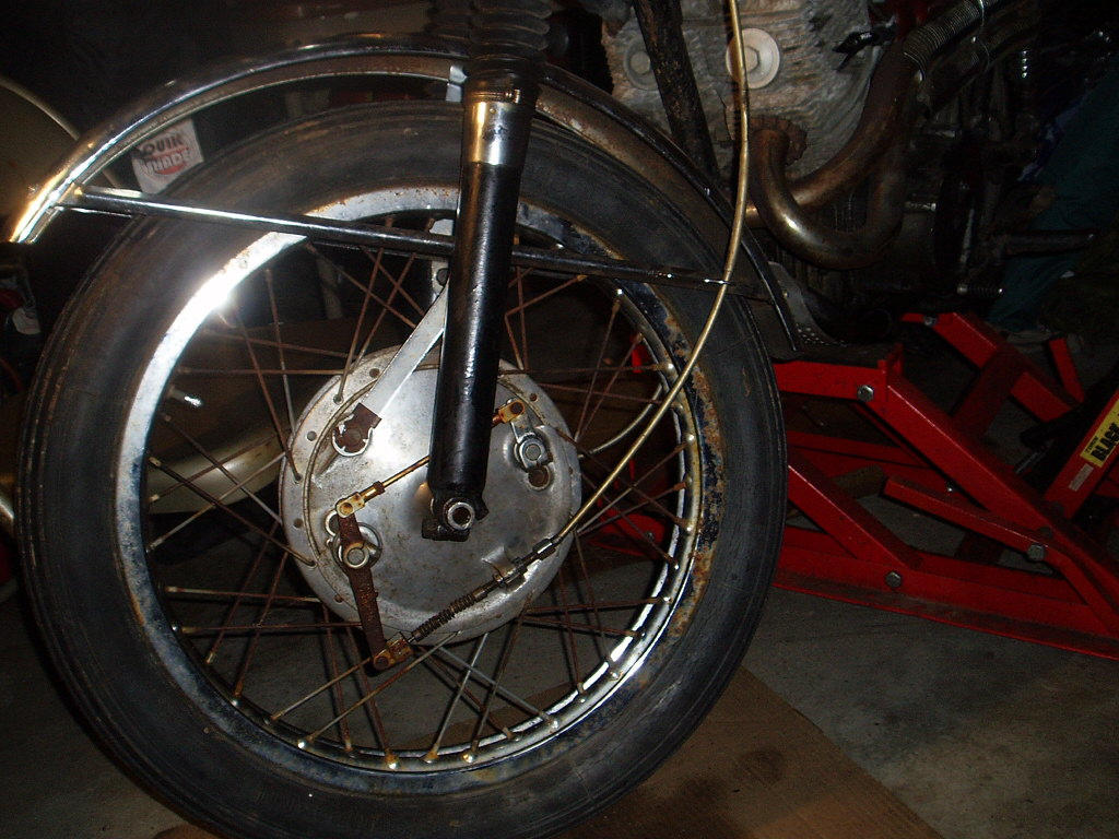 This afternoon, I mounted my DLS CL77 front wheel onto my SLS steel fork leg front end. I used the axle from the SLS wheel, which fit perfectly. The speedo drives are identical. I lined up and mounted the brake stay arm to the lower fender bracket with no modifications. The welded tab on the fork tube for the SLS brake plate is not in the way; the DLS linkage moves freely. Tomorrow, I'll mount some good rubber and take it for a ride. I also have a question about my front fender. It is an aftermarket fender with the word "Beck" in an oval, and "Made in Japan" under the oval Hopefully, the photos I've attached are helpful. Thanks, Bob B