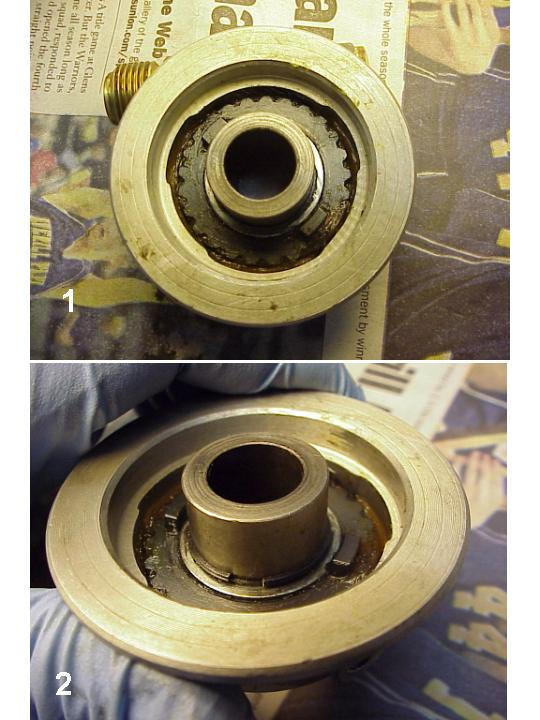 1. Warm the housing with a heat gun or torch (be careful not to over heat) to allow the seal to be removed without damage. Pry seal with screwdriver or similar, not forcing. Heat the housing so it is not too hot to hold and let it heat soak. This will loosen up the old grease that holding the seal in place. Light pressure is all that is needed once the heat has done it's job. Photo 1 shows the assembly with the seal removed exposing the drive gear. Grease has been cleaned out here.