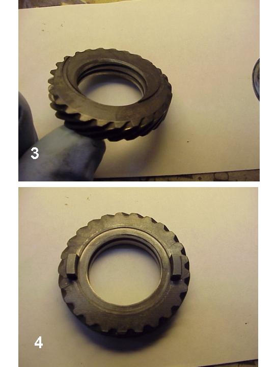 6. Now clean the removed parts. The drive gear is shown in Photos 3 and 4. Note the grease grooves in both the back face of the gear and the inner diameter. Clean these grooves out well. Clean the shims, thrust washer and snap ring and set aside. Don't forget to clean the seal if being reused.