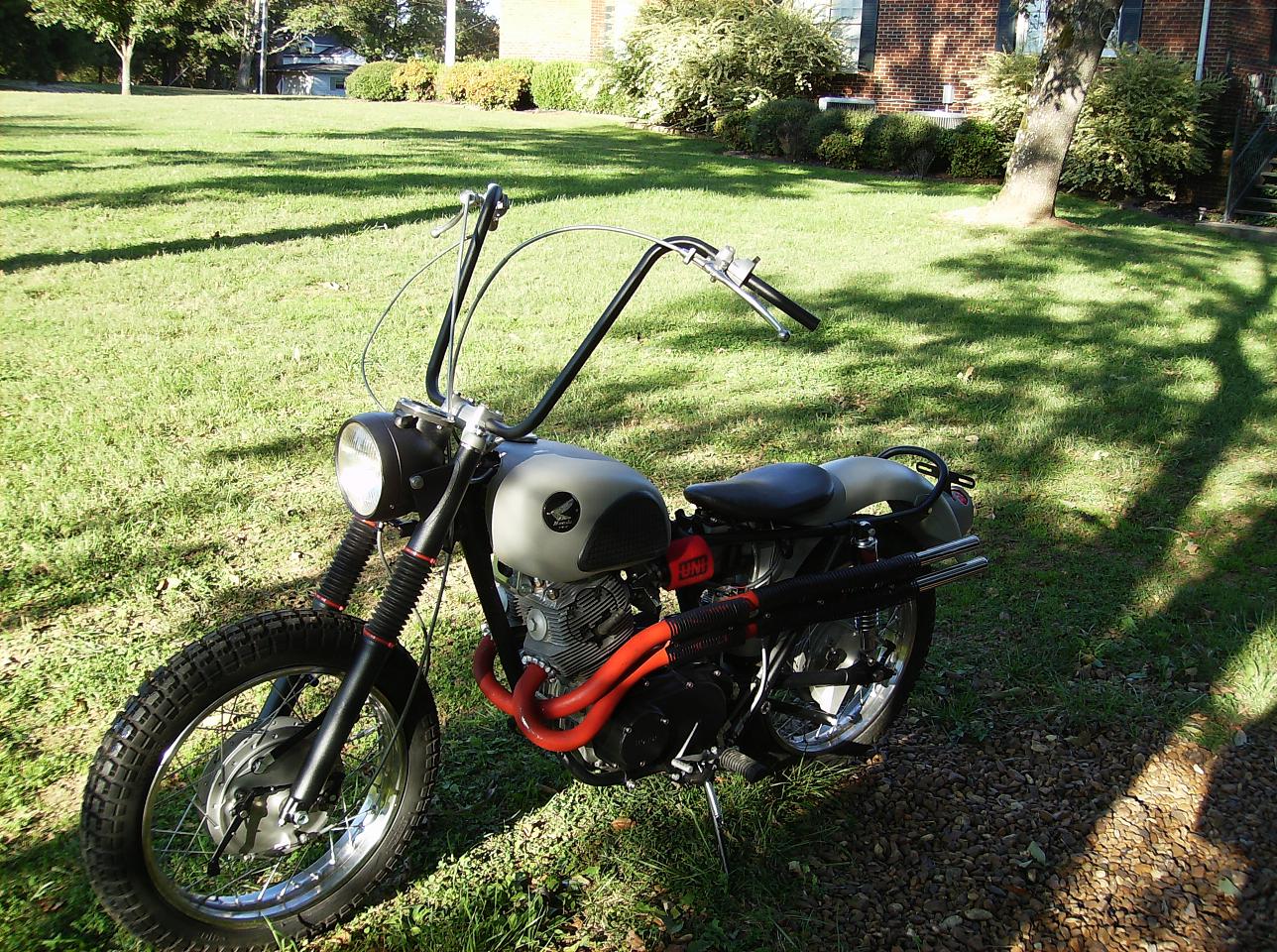 I had a bone stock White CB77 with bicycle ape hangers back in 71'. As a matter of fact, I put ape hangers on everything I rode when I was a kid. We lived in the same town as the Murray Bicycle plant. Used to go to the city dump where you sometimes would find literally thousands of tires, handlebars, wheels, frames, seats, cables, and you name it. I assume, back then they were bringing this stuff in from Asia for pennies and if there was an issue, off to the dump it'd go. It was like Christmas every two weeks when we took off the trash.