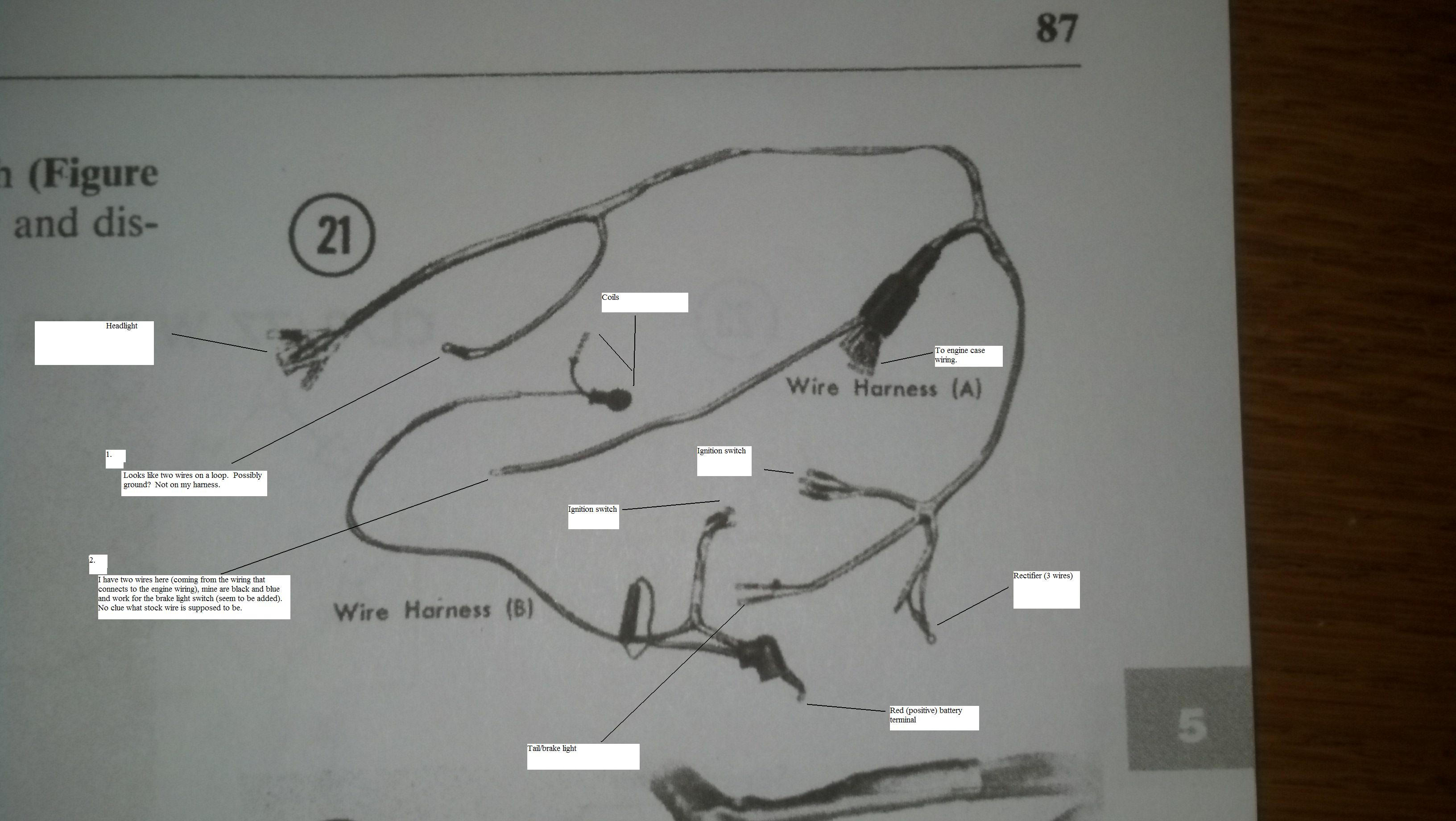 Also I've attached a picture of the wiring harness from the Clymer's manual for a reference. I've modded it to explain/question some things.
