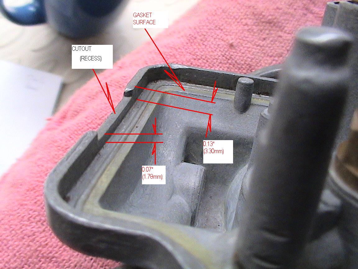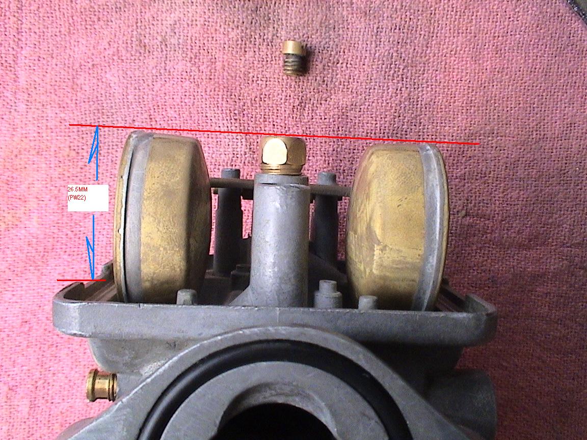 Interesting that IF you measure the PW22 float height (26.5mm) from the carb body recess (not gasket surface)....as Steve's float gauge shows, the float lines up with the main jet holder (jet removed), as with LM's method for PW26's.
