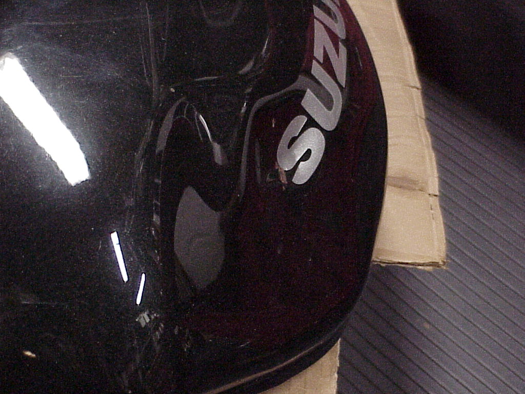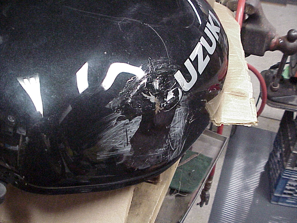 I want to reiterate here that the glue will pull off and you will have to repeat the heating and gluing process over and over as you pull the dent. For Davo's, I think he'll be done in a few minutes. But I spent hours pulling the dents on my SV tank that was bashed in on both sides when the steering stop sheared off, on top from who knows what and towards the back from a knee. I had to do this when I bought it because the PO had run off the road in the dark when he missed a turn and later when I wadded it at Pocono IR. It actually came out better the second time around and I used even less bondo for the stuff I could not pull or smooth out than I did the first time.