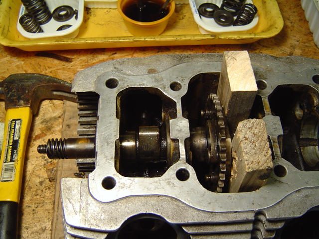 Therefore I put some wood between the camshaft (turn the camshaft so the biggest part is up) and the cilinderhead frame. Then you can hit the axle and the bearing won't slide out.