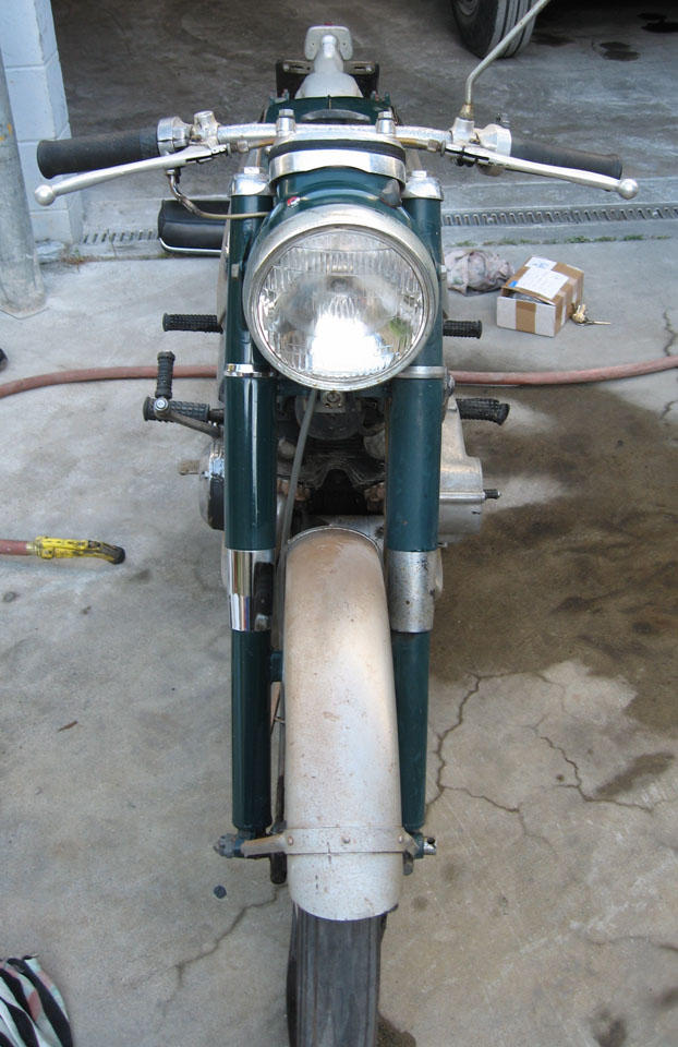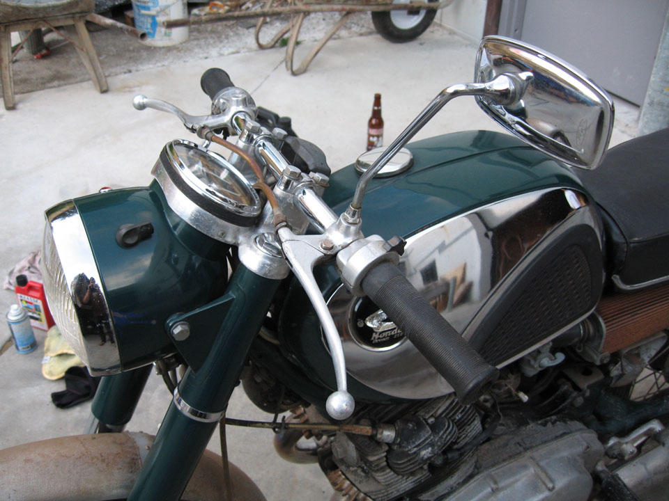 The story thus far: I bought a 1966 CB77 for $500 on Craigslist. The bike was missing some parts so I posted a wanted ad on Craigslist for a parts bike. I got a response to the effect that a guy had a 1961 CB72, he was the original owner, the bike had been off the road since the early 70's. He and his brother raced it in small town events around California from 62-65 or so, some noteworthy tracks he raced on were Laguna Seca, Vacaville and Cotati. I honestly thought this response was a joke at my expense, since a 1961 CB72 is a rare bike. A telephone conversation the following evening proved me wrong though. A week and more money than I really wanted to spend later I had a British Racing Green 1961 CB72 in the back of my truck with a box of parts that included a factory valve spring compressor tool, all 3 CYB shift linkages, 5 or 6 different rear sprocket sizes and some other neat misc. Many of the small differences between the early and late bikes can be seen in these 'As Found' pictures.