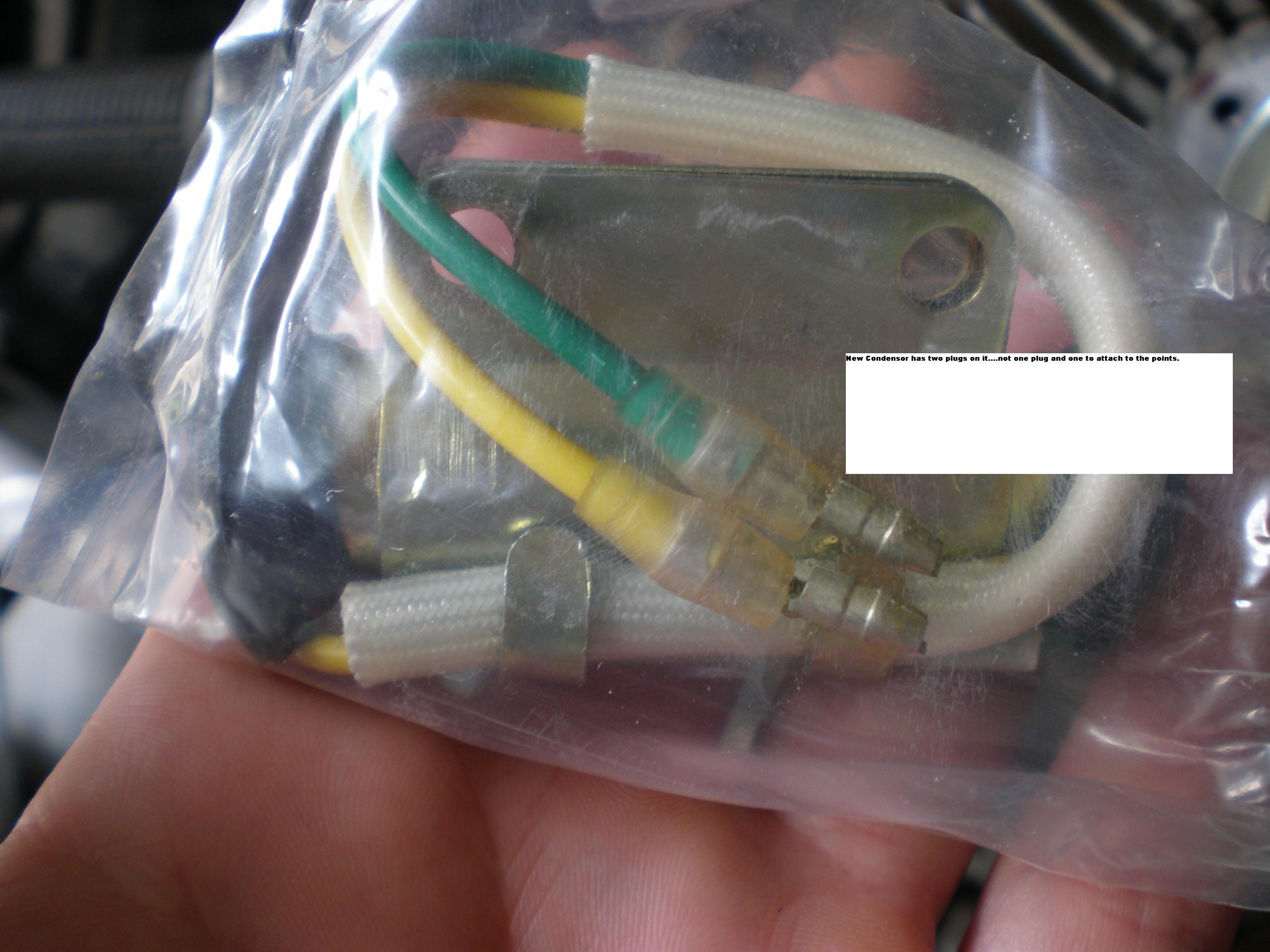 The part I'm holding is the new condenser.....the terminals on the end of the wires aren't what's on the old condensor...