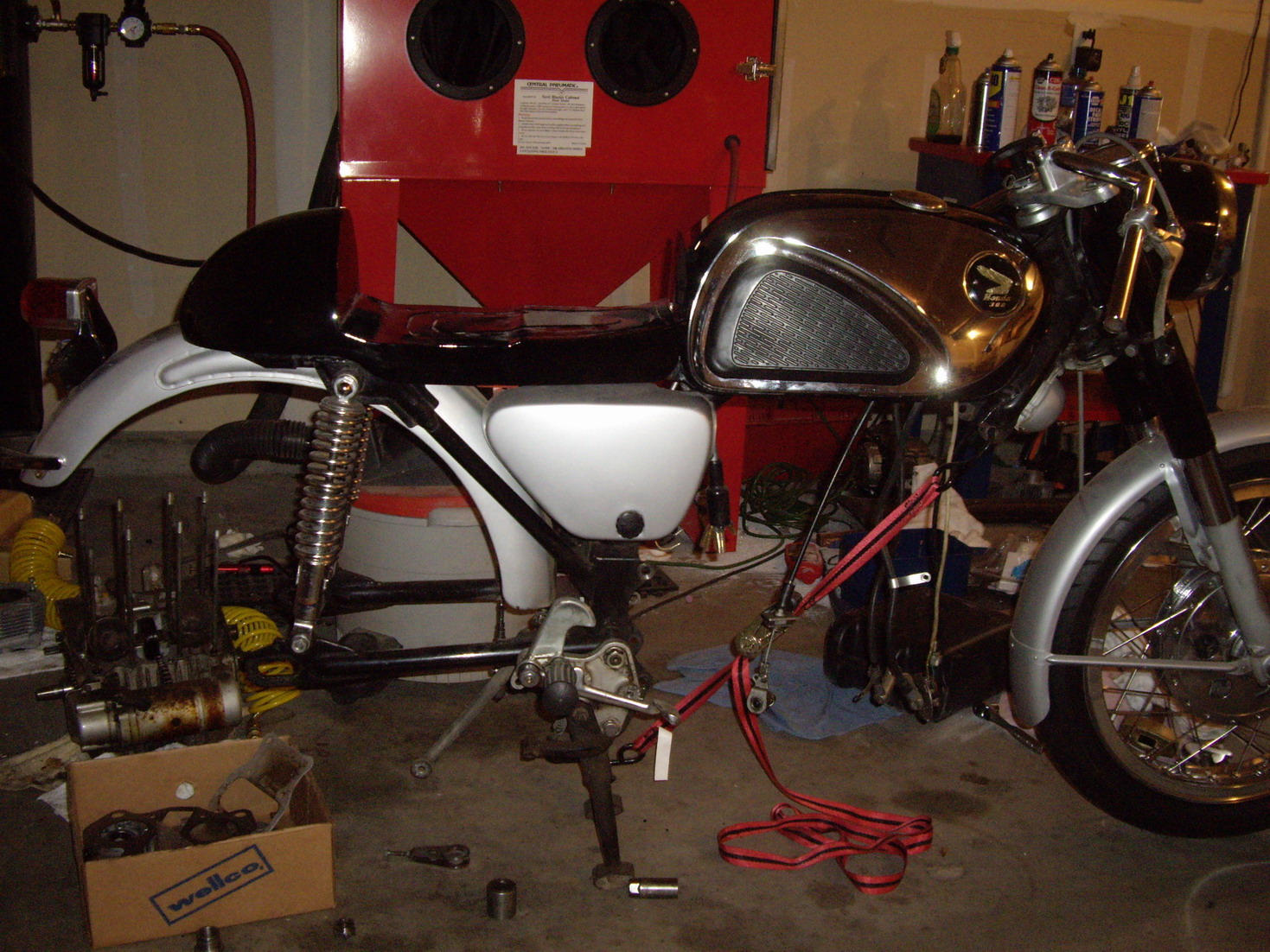 Hello all. Still new to this website, so first of all, thanks for the responses to my other listings regarding my white '65 CB77. It is now completely disassembled, but I have decided to put it on the back burner at least until I get my '67 finished. I just got the seat pan and front wheel finished, and thought that I would share some pictures of how it is looking. The seat was hand made out of sheet metal (not by me) and is still awaiting upholstery. I am planning on going with gray leather. sewn in strips like the old factory racing seats. I had the front hub drilled out, and am using Excel shouldered aluminum rims with stainless steel spokes/nipples. The tires are Avons, and fit very nicely with no clearance problems with the front fender. Still waiting on the rear wheel. I hope to have the top end on the motor within the next week or so. I am leaving it mostly stock, with the exception of a Megacycle cam and electronic ignition. The pistons and rings appear to be fairly fresh (I have the service records since '69 - thanks to some Air Force mechanic) and appear so as well. Well, thats about it for now. Thanks again for the responses, and sorry for the mess in the pictures. My wife isn't too happy about it either.
