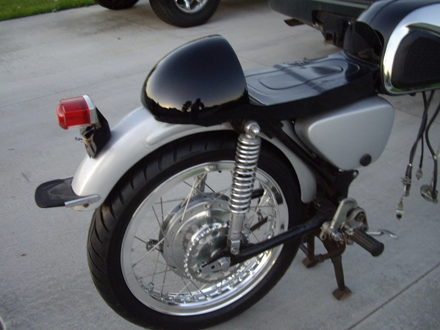 deez - I am using Excel shouldered aluminum rims, 2.15X18 in the rear and 1.85X18 in the front. As for the tires, they are Avon Roadriders, 100/90X18 in the rear and 90/90X18 in the front. I got the rear wheel finished, and it looks great mounted on the bike. I took some more pictures, but outside this time, and they look a little better, albeit a bit out of focus. Now just to strip it down all the way and powdercoat the frame and paint the fenders, sidepanels, etc. I sure can't wait to get this bike finished, especially since I was only able to get in a few rides before it lost spark to the right cylinder, and it seemed like a sign to go ahead and fix her up.