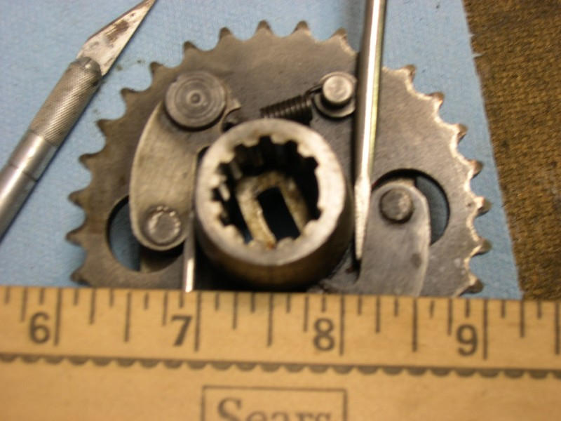 Attached is a pic of my camshaft sprocket advancer with the advance weights open and under no tension. I slid the tips of two screwdrivers into the gaps to provide better definition for the camera lens. The screwdriver tips are not opening the weights any farther than the weights normally go while at rest.