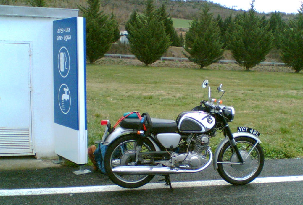 We made it! 13 hours, 444 miles and one seizure (CB, not me!). We disembarked the Portsmouth-Bilbao ferry at 0800 GMT+1 and crossed the Greenwich Meridian on Saturday at about 1630 from west to east (no timezone change), making Barcelona by 2100. Battery has died enough to prevent starting on the button and, embarrassingly, the kickstart is temperamental, missing the ratchet on occasion and requiring either pushing the bike astern in second gear about a metre or a bump-start!. A litre of oil, about 65mpg and 2 chain adjustments; lost the tacho, then the speedo (hairsprings have failed, I think) and the lefthand rear wheel adjuster screw. The front parking light lamp has popped (a Stanley, so possibly the original!?), the 3 oil spots are now 5 blobs. The lefthand footrest/shifter fulcrum thread has stripped in the alloy peg bracket, which I'll Helicoil. Plugs have stayed a nice, sandy colour. Then pressure from the clutch cable sheared the petrol tank balance pipe where it attaches to the righthand spigot, leaving about 2 litres of gas on the car deck of the ferry. Luckily I was present when it happened, just securing the bike for the crossing. The crew guys on the ferry were marvellous, producing a bag of sawdust and clearing it up for me within 5 minutes; mind you, I was parked in front of a brand-spanking new, Swiss-plated pearlescent Champagne Bentley Continental GT, upon the bonnet (hood) of which the bo'sun placed his opened pocket knife; no respec'! Didn't want that catching fire, but sod the paintwork. Yada yada yada....
