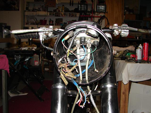 Progress as of today: wiring harness sort of installed, levers, and perches on, wiring routed into headlight bucket, various stuff cleaned. I finished installing a new speedo glass ( actually 0.1 in plexiglass-closest thing available locally.) I will know next time to vacuum the speedo before I install the plexiglas. The static pulls everything out of the guts of the speedo.