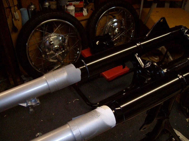 I painted my front forks without removing them. Your frame is stripped down the same as mine right now. I just tipped the frame back so the forks were horizontal and masked off the parts I didn't want painted. It actual made a nice stand for painting. I have a picture of this in my other post.