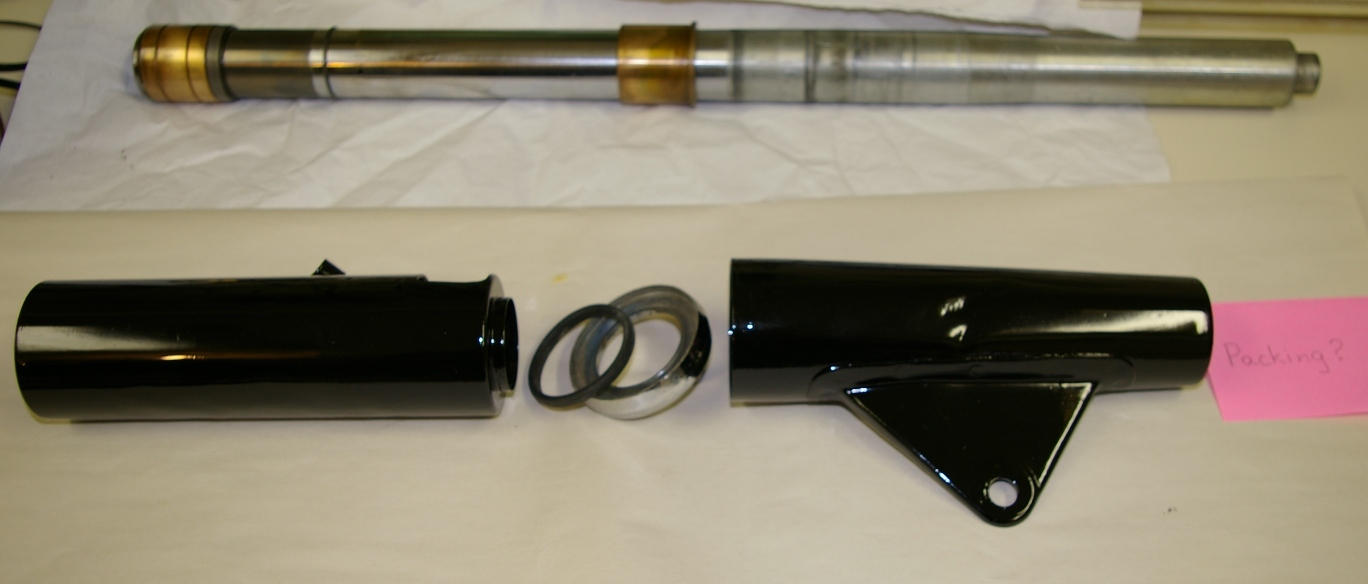I'm just about to put the right fork back together and I'm curious about the packing arrangement. In the photo I've laid out the covers, fork rib and rib packing in the order I think they should go, but I'm not sure about any packing between the top cover and the fork bridge.