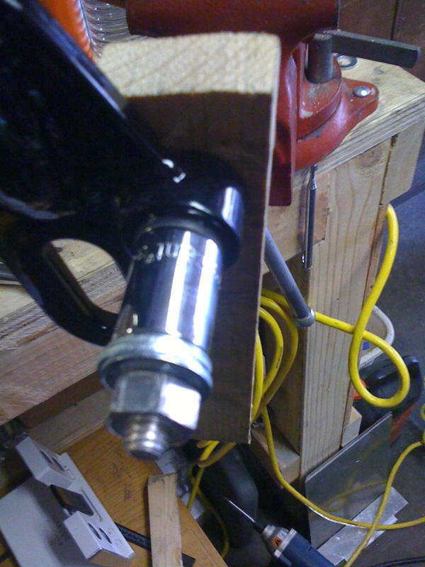 id thought i would share an easy way to get swingarm shock bushings in and out. i didnt take photos of taking them out but here are a few photos of putting them in. just drill a hole in a piece of wood, stick a bolt through it and use the proper
