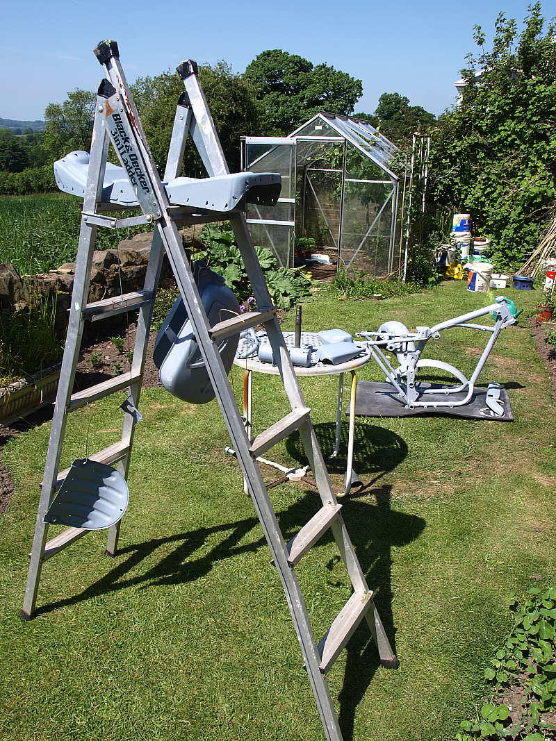 The sun came out this weekend so I got started on those parts which were ready to go. The colour is a non-standard metallic blue (trophy blue) used on recent MG cars in the UK. I think that it will go nicely with the silver fenders and tank. Hopefully Mr Honda won't mind as he used a similar colour on later Hondas in the UK.