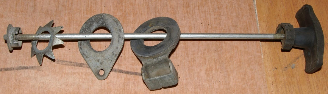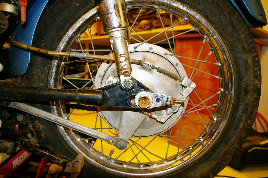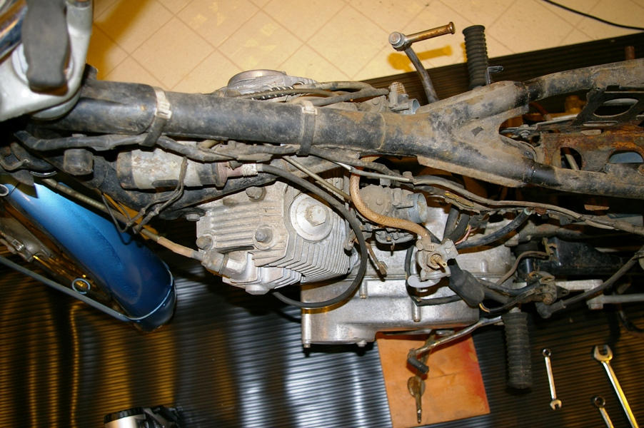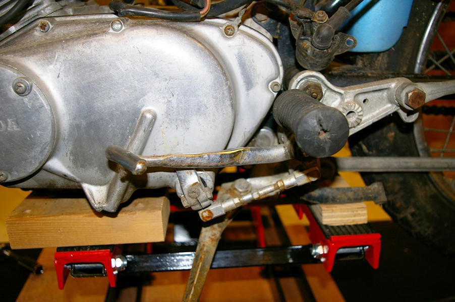 The rear shock shows a bit of road rash (possibly related to the deformed shift lever), and the crack and hole in the rear brake stopper arm are bad news. Fortunately FASTFRED has since supplied me with good used ones in addition to brake and clutch levers and a new carb bowl amongst other things.