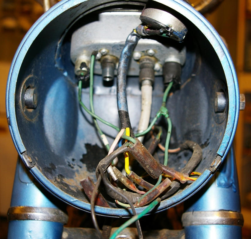 The front terminus of the wiring rat's nest--I think this is typical for an old machine. Reminds me of the wiring on the old gill-netter I once owned.