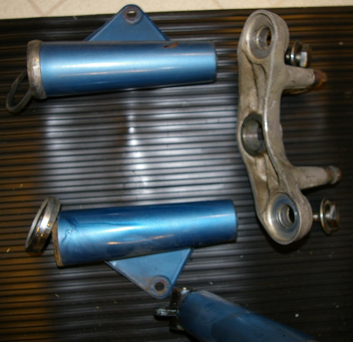 It's day 6 and time to tackle the front forks--the right one has been leaking all along, so they will both get new seals sometime soon. Fortunately there was a selection of steering damper rods in the spares box (I'm thankful to the donor for having held onto some of this stuff--he must have had an eye to restoring it at one time). I'll mix up a new batch of plating solution and make the metal parts all nice and bright again.