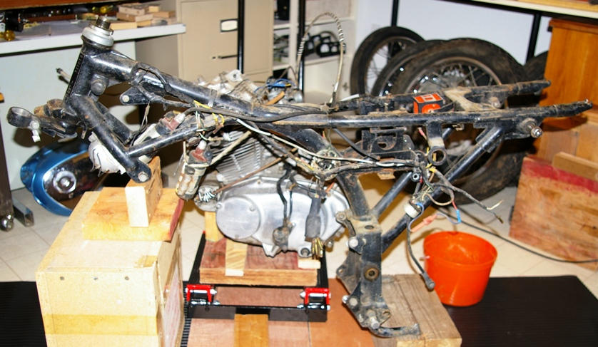 The bike will have to be stripped to the frame for cleaning and repainting, and it looks like the rear fender has already had some body work done to it (probably related to the twisted seat).