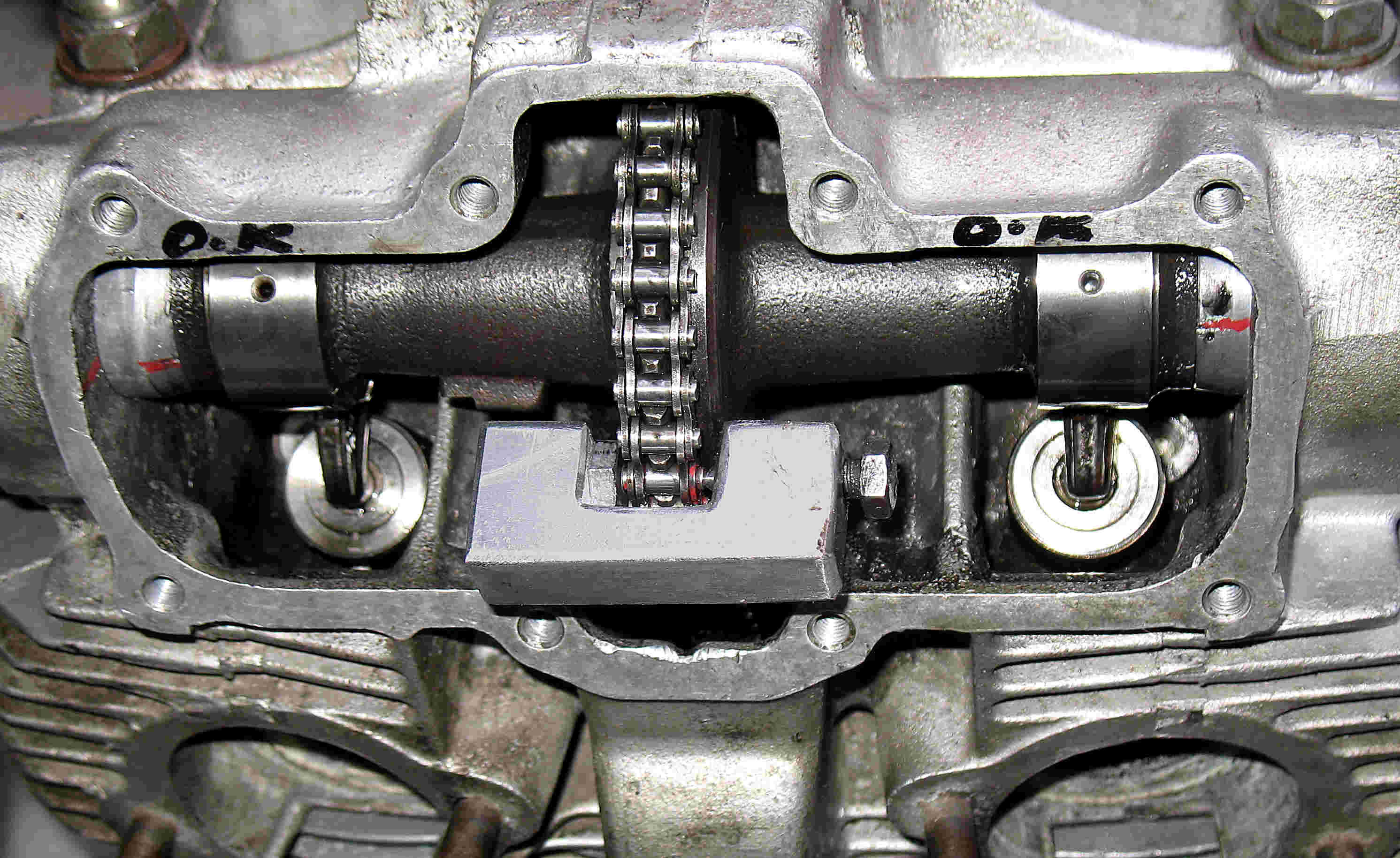 The reason I used the CB450 chain , (shortened ), is that I had one spare. I have attached, I hope, a photo of my home made rivet -up tool, made from a piece of scrap metal, two holes drilled and tapped to 6mm and two bolts fitted, one of which I ground down to a slight point, which I hardened by heating to red hot and quenching in water.