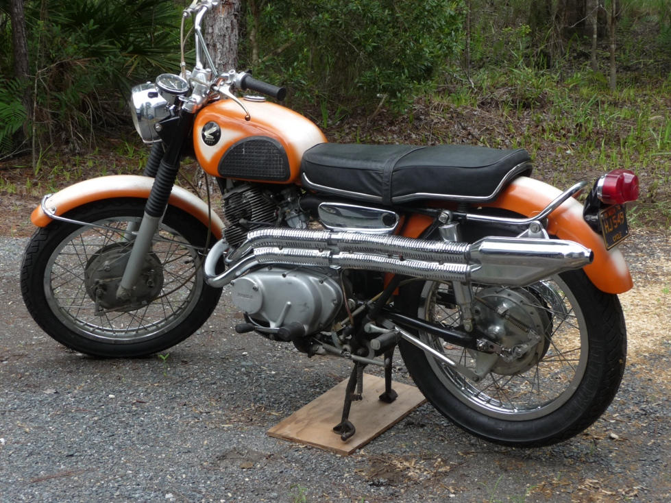 Guys - Someone in my "New Forum Member" thread asked for some pictures of my 1967 CL77 that I have owned since new. I washed it up, changed to new tires (Pirella MT660's), and pulled it out front for a few unrestored pictures. I plan to start it up tomorrow after its 36 year slumber. Sharp eyes will note that the mirrors are not installed, the fuel petcock is missing and the toolbox is not there. I forgot to install the toolbox when I cleaned out the air cleaner area, the petcock rebuild parts just arrived this evening and the mirrors are in one of the many unpacked boxes from our move to Florida.