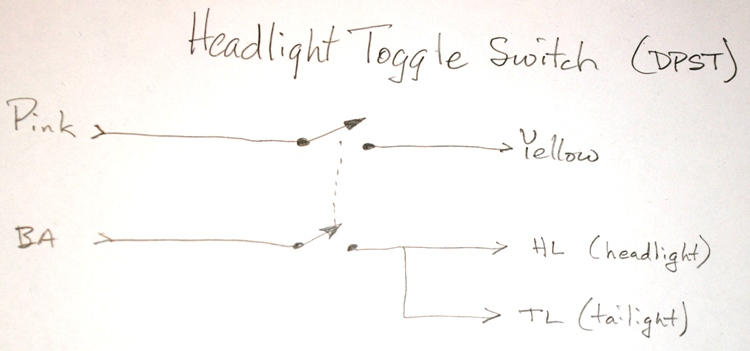 I think the headlight wiring can be done with a DPST (double pole, single throw) switch. The way I am envisioning it, one pole will connect the pink to the yellow when the switch is toggled 'on'. That covers the generator.