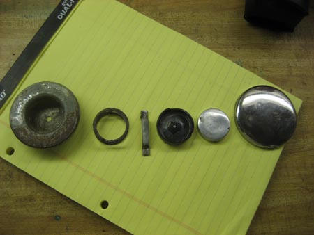 On my starting list, I think I have the fuel problem solved. The PO had rebuilt the carb, then replaced it with a later rebuilt carb. He had also put Kreem in the fuel tank. Beware, don't do that while using the fuel cap!!. It was totally plugged, and as far as I can tell that was causing the fueling problem. I fooled with it and got it running good with a loose cap, so I pulled the cap apart and it was really Kreemed! Everything was stuck together, the spring would hardly move it was so packed in there. The hole in the rubber diaphram was plugged (still is, trying not to destroy it) and it was even partially glued to the chrome top. While I have it apart I thought I'd include a picture of it in pieces for anyone's reference.