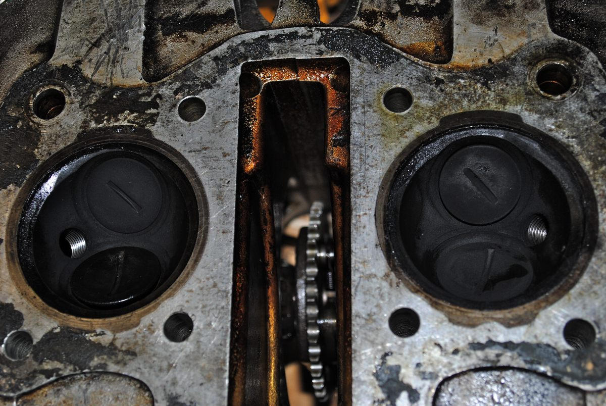 A) I'm posting some pics of the cylinders and the valves as I saw them when I split the head.There's no overt scarring or dents, just a lot of oil and carbon, but I have no expertise in these matters and I might be overlooking a serious issue. If any of you would be so kind as to look at the pics and share your assessment, it would be invaluable.