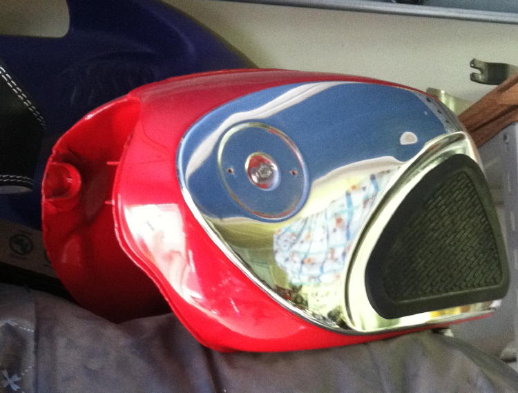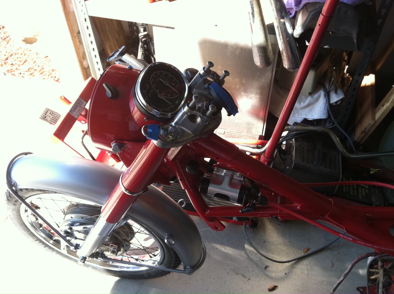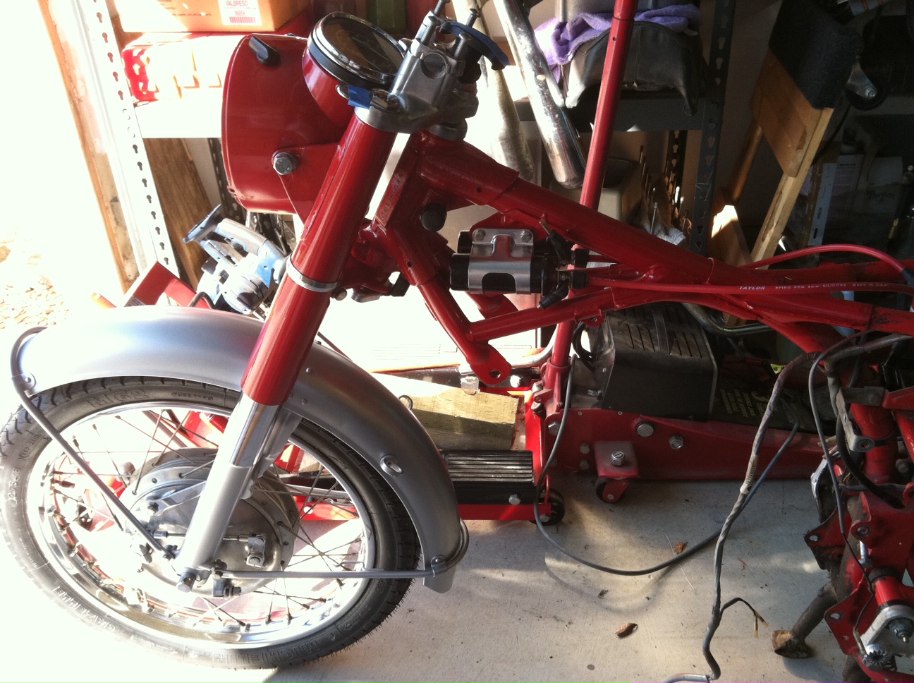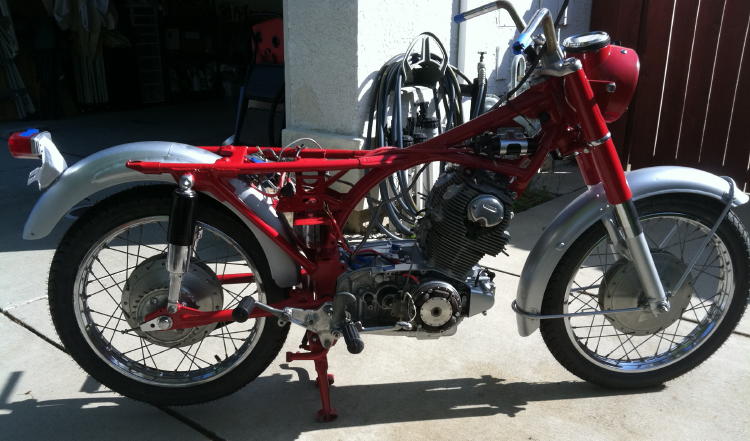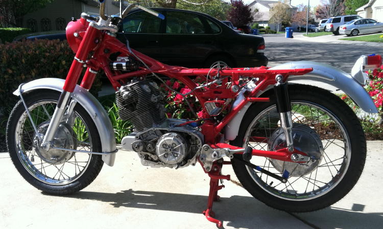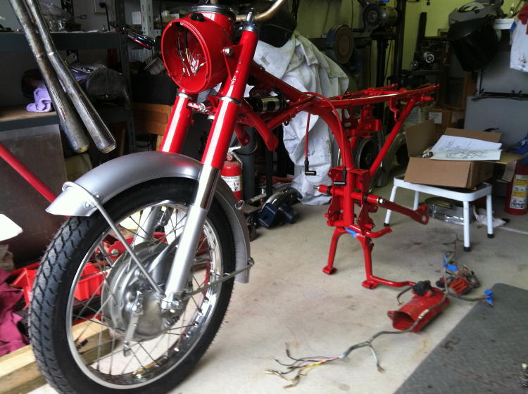 frame painted, front end mostly done, motor mostly done. Swing arm, center stand on. Working on harness.