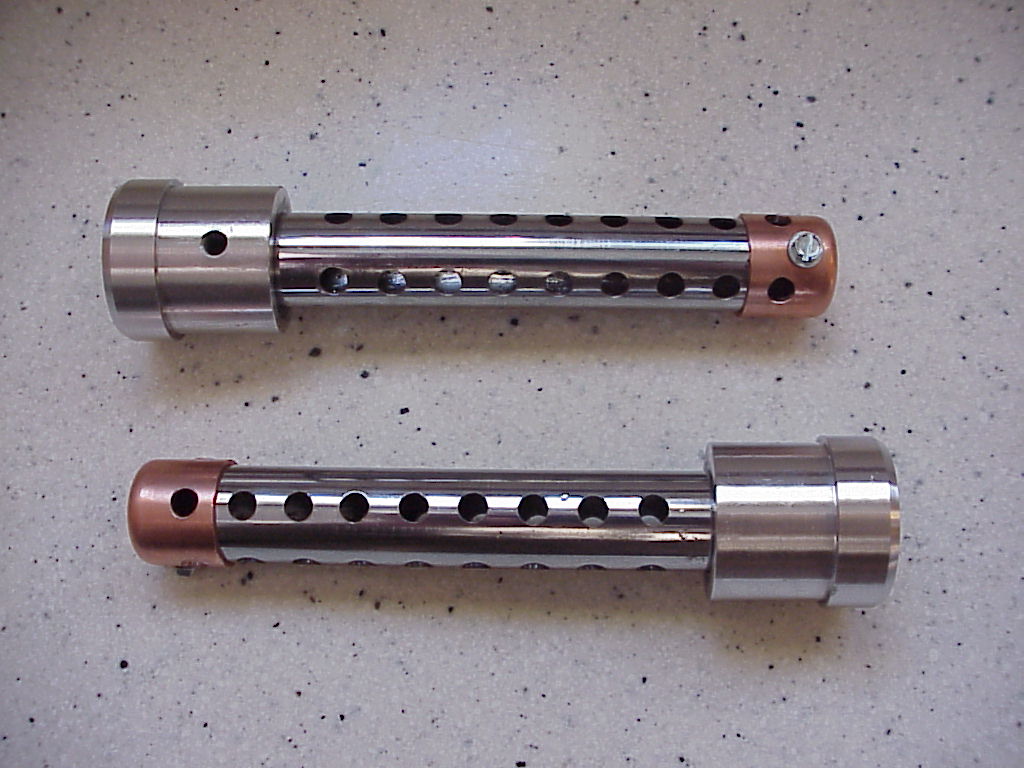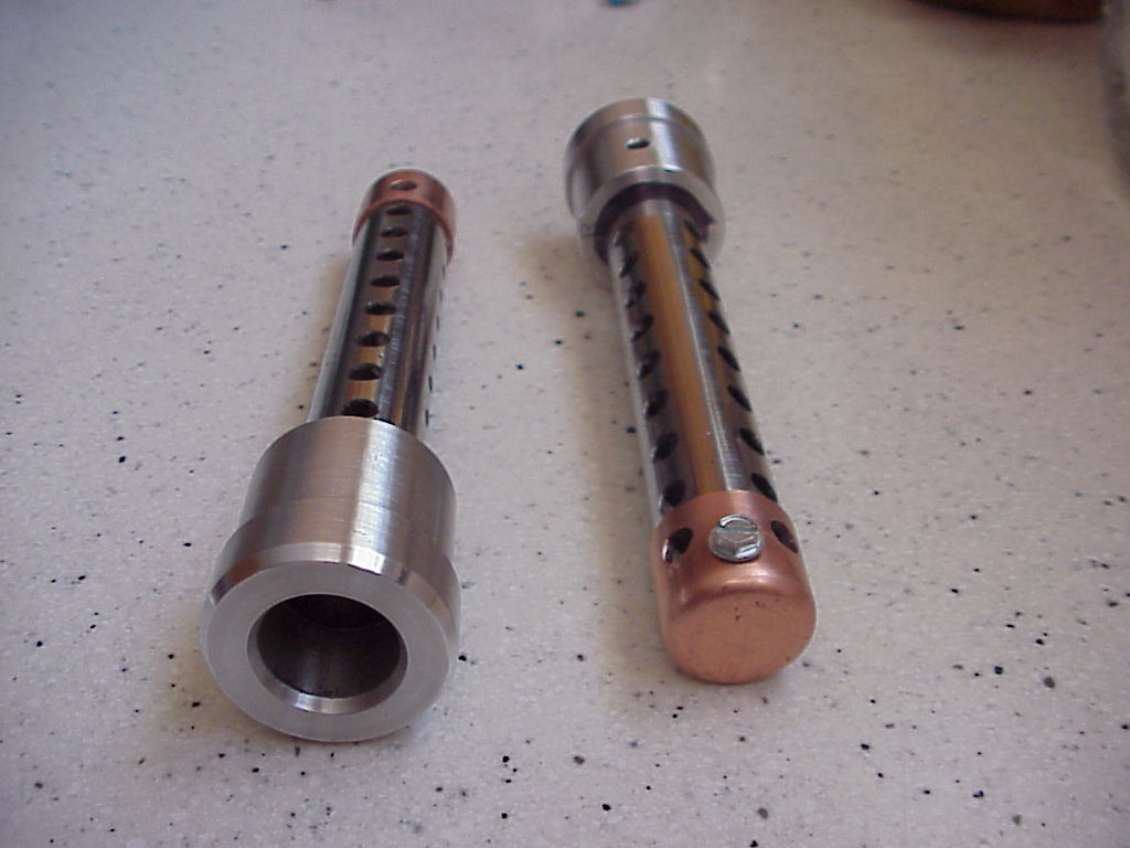 Attached is the final product. The baffle is a piece of 7/8" OD steel thin wall tubing I had in my stock, which was the handle for an old Toro electric snoblower I had thrown out. It's actuall chrome plated. I've used that handle tubing for a bunch of projects and this is yet another. The end cap is a simple 3/4" copper tubing end cap. 99 cents each. It is held in place with a self-tapping sheet metal screw.