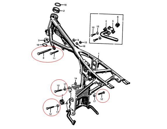 There should be six; two top hangars and 4 rear. The picture only shows three at the rear, but the description does show 4. The lower rear bolt on the left side is replaced with a longer one if the optional side stand is installed. That picture also shows the lock washers under the bolt head. That's not right either, they should go on the other side against the nut. When it comes to these 60's parts fiches, "Believe only half of what you see and nothing that you hear" (Edgar Allan Poe). I may have a spare nut and bolt if you need it, and I would strongly recommend using all 6.