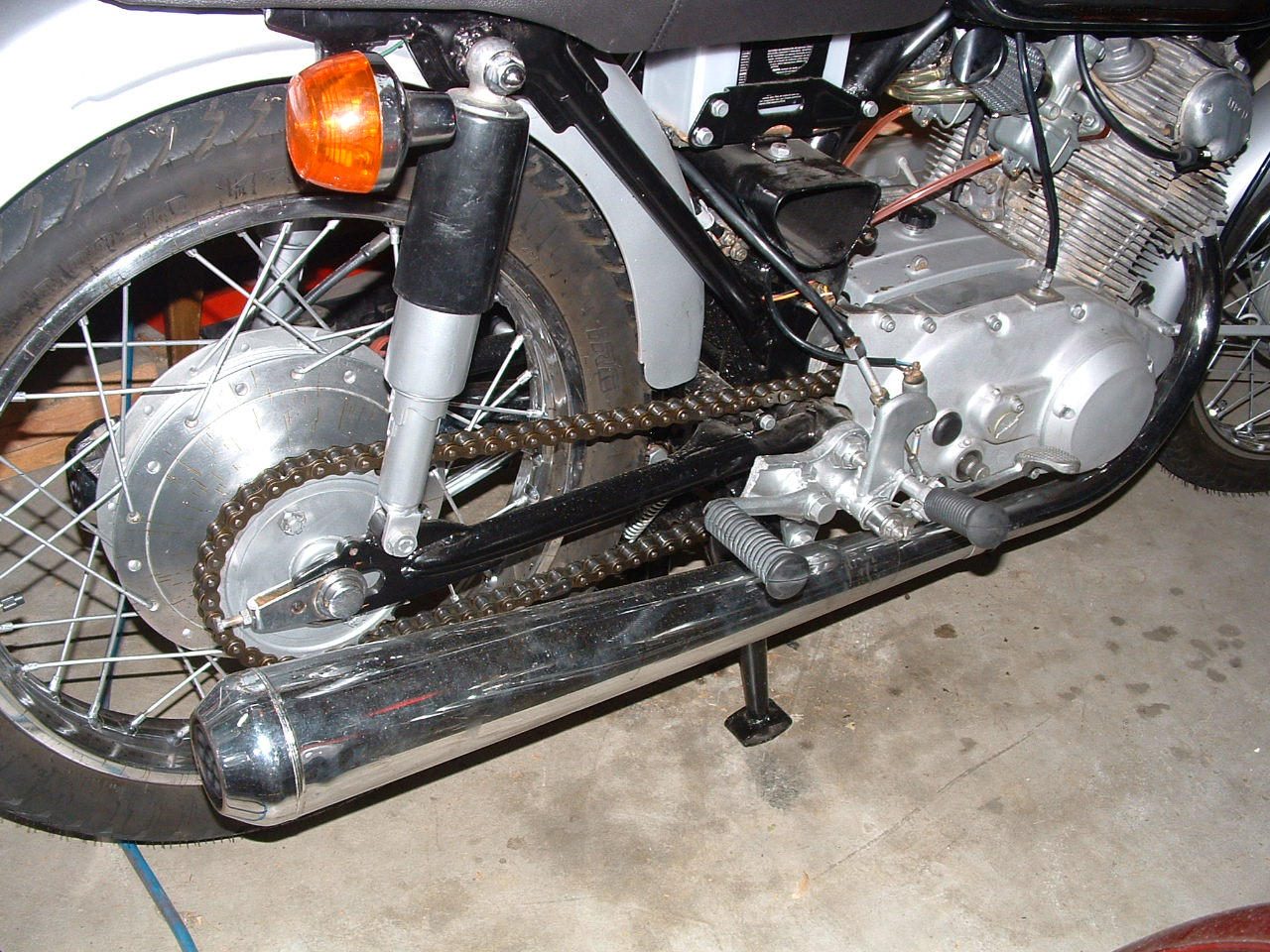 Seat is done without trim installed, controls and signals are 1969. Mirrors are cheapo but I was going for 1969 look here too. Mufflers are cheap BSA style aftermarkets that I got a deal on because the bolts had torn out of the brackets. Welded one by one stainless angle to them and bolted through the original exhaust holders sticking out under the swing arm.